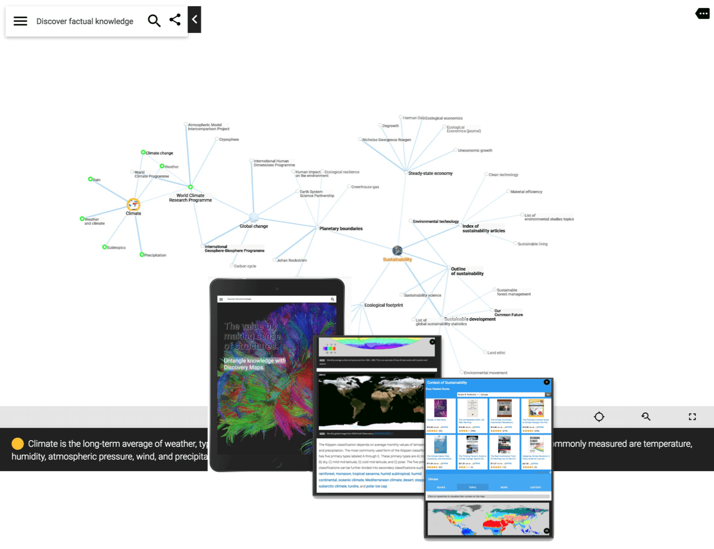 Maps created with platforms are automatically entity-linked, to increase discoverability of content and reach out to public audiences, and support aggregation of documents, media and data. A story told with a knowledge map uncovers the connections between concepts of science, technology, their applications and historical background. The reader can uncover the context of topics and concepts that are new or difficult to understand, like technical keywords, having access to a deeper comprehension of the content.