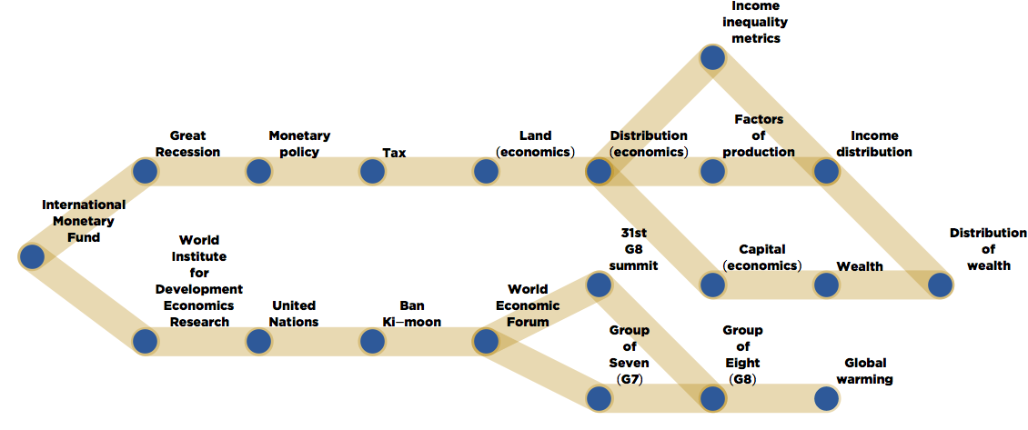 Reasoning about Global Warming and Wealth Inequality - automatic suggestions by Nifty.works’ generic discovery engine. Each suggestion can be different: this example brings up global warming as associated to monetary policies implemented over economics resources, whose distribution determines wealth inequality.
